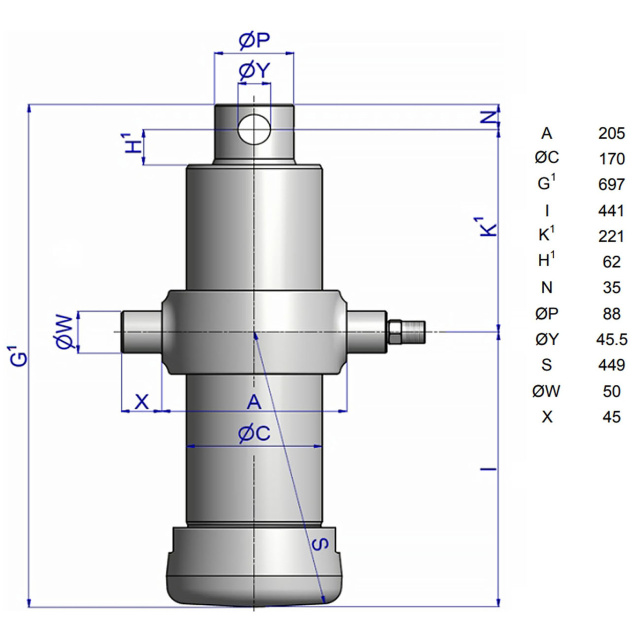 Циліндр легкий, використовує менше масла, що дозволяє швидше підіймати та опускати кузов, і він міцний та не вимагає обслуговування. Кочення маси розраховано на 220 бар. Елементи кріплення необхідно замовляти окремо.