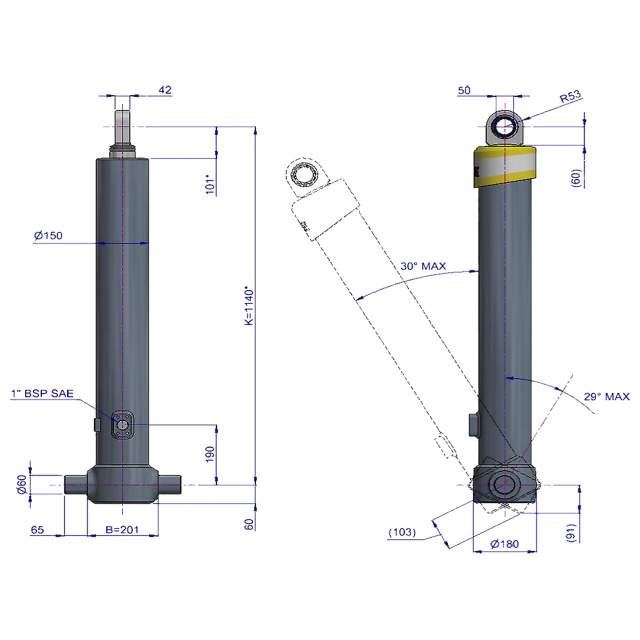 Модель фронтального гідроциліндра Hyva FE A129-4-03420-001-K1140-HC з одним вушком (FE) оснащена чотирма хромованими штоками, що забезпечує підвищену міцність і довговічність конструкції. Циліндр розрахований на підйом вантажів масою до 47 тонн, при цьому його повний хід становить 3420 мм, а робочий тиск — 250 бар. Ефективний діаметр штока — 129 мм, вага виробу — 116 кг.