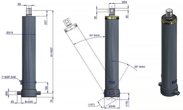 Цей циліндр є лише підйомним пристроєм. Його не слід використовувати як елемент конструкції і не слід піддавати бічним навантаженням. Перекидальний клапан повинен мати скидання тиску на отворі циліндра, встановлене не вище макс. робочого тиску Переконайтеся у максимальному навантаженні на циліндр. Робочий діапазон температур становить від -40°C до +80°C. Максимальна тривалість висування становить 0,5 години (за винятком загартованих ступенів із твердим хромуванням).Циліндр пофарбований у чорний колір (RAL9005) з мінімальною товщиною покриття, що відповідає 480-годинному випробуванню в нейтральному сольовому тумані згідно з ISO 9227. ¹ Обмежувач ходу циліндра Hyva.