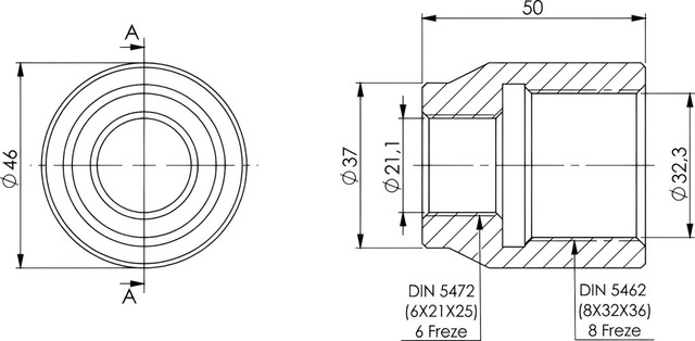 - З'єднує вали з 6 шліцами (діаметр 25 мм за DIN 5472) та 8 шліцями (діаметр 36 мм за DIN 5462)