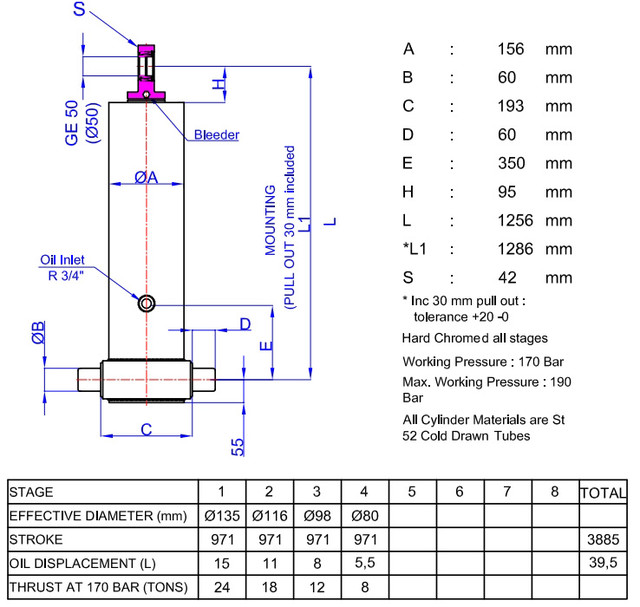 Характеристики гідроциліндра GHS 135-4-3885-L1256 C (43135438853-01-001)