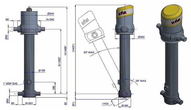 Цей циліндр є лише підйомним пристроєм. Його не слід використовувати як елемент конструкції і не слід піддавати бічним навантаженням. Перекидальний клапан повинен мати скидання тиску на отворі циліндра, встановлене не вище макс. робочого тиску Перевірте максимальне навантаження на циліндр. Робочий діапазон температур становить від -40°C до +80°C. Максимальна тривалість висування становить 0,5 години (за винятком загартованих ступенів із твердим хромуванням). Циліндр пофарбований у чорний колір (RAL9005) з мінімальною товщиною покриття, що відповідає 480-годинному випробуванню в нейтральному сольовому тумані згідно з ISO 9227. ¹ Обмежувач ходу циліндра Hyva.