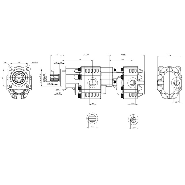 Приєднувальний стандарт: Вал B8x32x36 (8 шліців, Ø36 мм), Монтажний фланець ISO (4 отвори, 80x80).