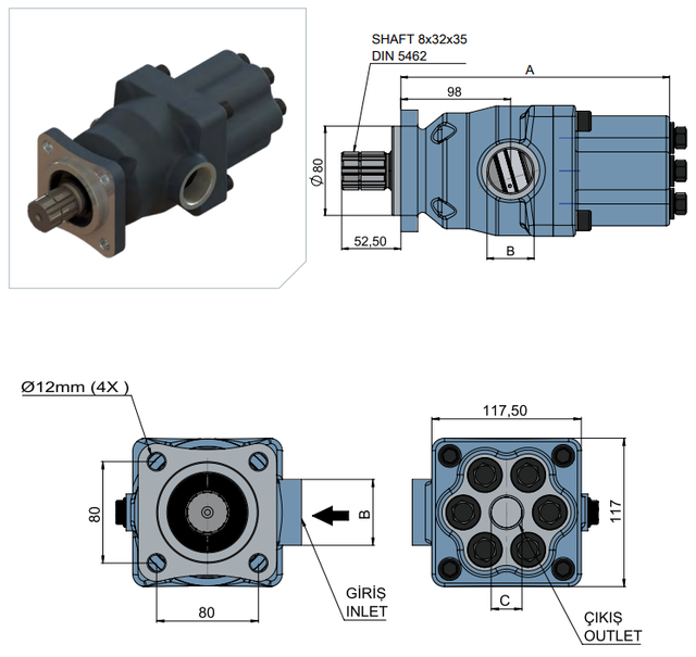 Стандарт приєднання: Вал B8x32x36 (8 шліців, Ø36 мм), монтажний фланець ISO (4 отвори, 80x80).
