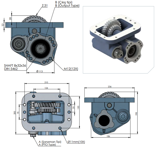 Стандарт приєднання: вал B8x32x36 (8 шліців, Ø36 мм), монтажний фланець ISO (4 отвори, 80x80 мм).