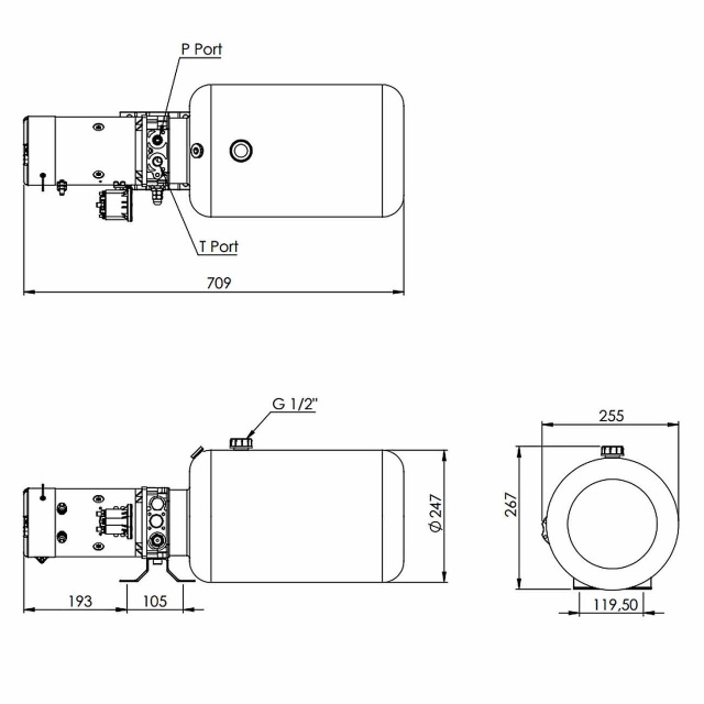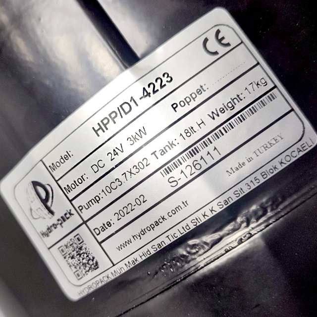 Міні-маслостанція Hydro-pack HPP/D1-4223 призначена для роботи з різними гідроциліндрами. Вона оснащена електродвигуном потужністю 3.0 кВт та працює при напрузі 24 В DC, швидкість обертання 3500 об/хв, максимальний робочий тиск до 110 бар. Насос станції має робочий об’єм 3.7 см3/об. Масляний бак об’ємом 18 літрів виконаний зі сталі та має циліндричну форму. Пристрій встановлюється в горизонтальному положенні.