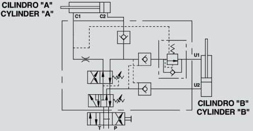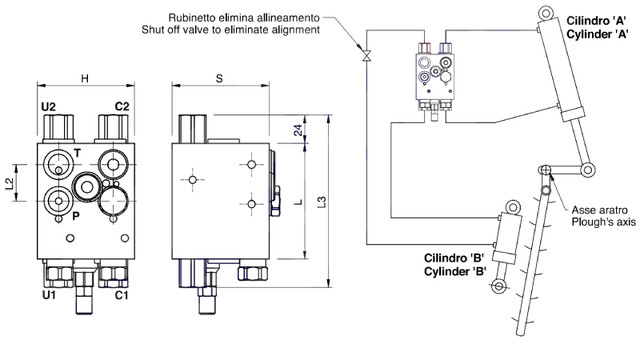 Поворот рами здійснюється через верх, що дозволяє встановити колесо для буксирування. Клапан призначений для використання з двома різними розмірами циліндрів: 70/80 мм та 80/100 мм. Принцип роботи такий: спочатку вирівнюючий циліндр вирівнює навантаження. Після досягнення кінцевої точки ходу він активує перекидальний циліндр, починаючи обертання. Потім вирівнюючий циліндр повертає плуг у робоче положення.