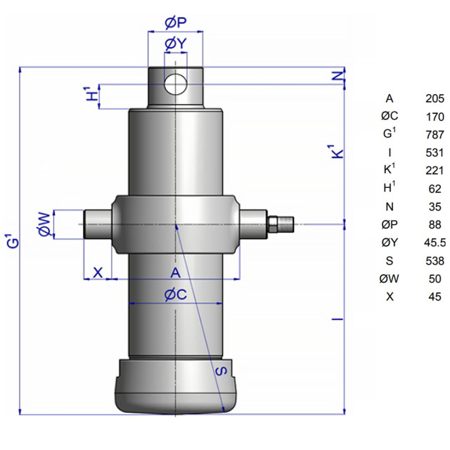 Циліндр легкий, використовує менше масла, що дозволяє швидше підіймати та опускати кузов, і він міцний та не вимагає обслуговування. Кочення маси розраховано на 220 бар. Елементи кріплення необхідно замовляти окремо.