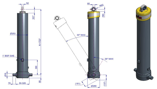 Цей циліндр є лише підйомним пристроєм. Його не слід використовувати як елемент конструкції і не слід піддавати бічним навантаженням. Перекидальний клапан повинен мати скидання тиску на отворі циліндра, встановлене не вище макс. робочого тиску Переконайтеся у максимальному навантаженні на циліндр. Робочий діапазон температур становить від -40°C до +80°C. Максимальна тривалість висування становить 0,5 години (за винятком загартованих ступенів із твердим хромуванням). Циліндр пофарбований у чорний колір (RAL9005) з мінімальною товщиною покриття, що відповідає 480-годинному випробуванню в нейтральному сольовому тумані згідно з ISO 9227. ¹ Обмежувач ходу циліндра Hyva.