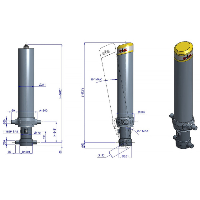 Цей циліндр призначений лише для підйому. Його не слід використовувати як конструкційний елемент і не слід піддавати бічним навантаженням. Клапан опрокидування повинен мати спуск тиску на отворі циліндра, встановлений не вище максимального робочого тиску. Переконайтеся в максимальному навантаженні на циліндр. Робочий діапазон температур від -40°C до +80°C. Максимальний час висування становить 0,5 години (за винятком закалених сходинок з твердим хромуванням). Циліндр пофарбований чорним кольором (RAL9005) з мінімальною товщиною покриття, відповідною 480-годинному випробуванню в нейтральному сольовому тумані відповідно до ISO 9227. ¹ Обмежувач ходу циліндра Hyva.