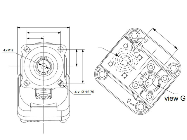 Нерегульований аксіально-поршневий насос з похилим блоком Hidrocel 2PBA правого обертання (за годинниковою стрілкою). Робочий об'єм складає 40 куб. см. Розрахований на роботу при номінальному тиску 350 бар і піковому 400 бар. Шліцьовий вал: 8-32-36 DIN ISO 14-NF.