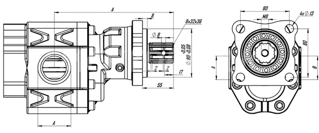 Приєднувальний стандарт: Вал B8x32x36 (8 шліців, Ø36 мм), Монтажний фланець ISO (4 отвори, 80x80).