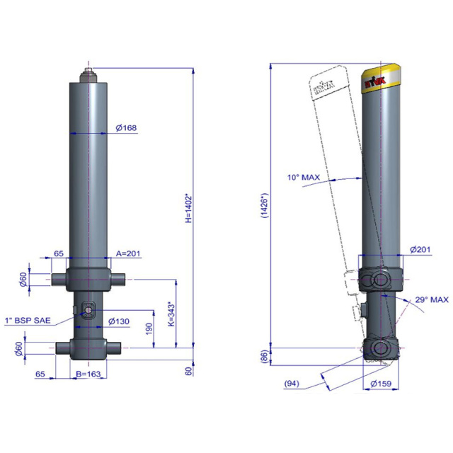 Створений для різних застосувань цей гідроциліндр з діаметром 110 мм і 3 штоками здатний піднімати до 50 тонн, досягаючи загального ходу 3235 мм. Маючи максимальний робочий тиск 250 бар, цей гідроциліндр від Hyva здатний піднімати більші навантаження, що, у свою чергу, дозволяє вантажівкам бути оснащеними компактнішими гідроциліндрами, економлячи місце і вагу. Циліндр підйому кузова FC A110-3-03235-000-K0343-HC серії Alpha в основному використовується в поєднанні з прямим з'єднанням корпусу та цапфовим типом з'єднання.