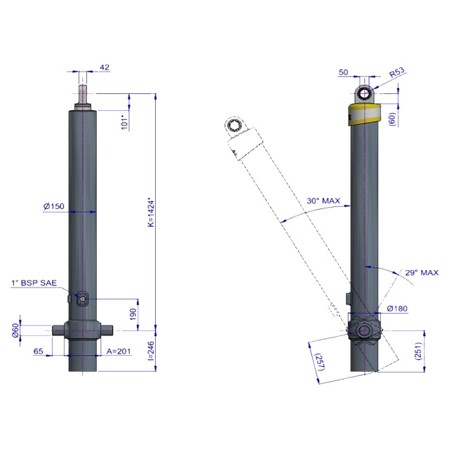 Модель фронтального гідроциліндра Hyva FE A129-3-03880-101-K1424-HC з одним вушком (FE) оснащена трьома хромованими штоками, що забезпечує високу міцність і довговічність конструкції. Циліндр розрахований на підйом вантажів вагою до 59 тонн, має повний хід 3880 мм і працює при тиску до 250 бар. Ефективний діаметр штока — 129 мм, маса виробу — 142 кг.