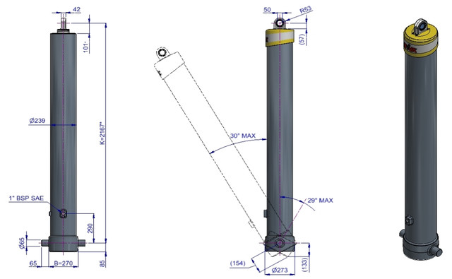 Цей циліндр є лише підйомним пристроєм. Його не слід використовувати як елемент конструкції і не слід піддавати бічним навантаженням. Перекидальний клапан повинен мати скидання тиску на отворі циліндра, встановлене не вище макс. робочого тиску Переконайтеся у максимальному навантаженні на циліндр. Робочий діапазон температур становить від -40°C до +80°C. Максимальна тривалість висування становить 0,5 години (за винятком загартованих ступенів із твердим хромуванням).Циліндр пофарбований у чорний колір (RAL9005) з мінімальною товщиною покриття, що відповідає 480-годинному випробуванню в нейтральному сольовому тумані згідно з ISO 9227. ¹ Обмежувач ходу циліндра Hyva.