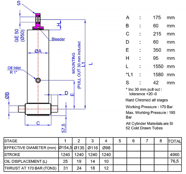 Цей гідроциліндр здатний витримувати максимальний тиск до 190 бар і має вантажопідйомність 31 тонна, що гарантує його надійність та ефективність у найвибагливіших умовах. Діаметр вуха GE 50 (Ø50) забезпечує надійне кріплення, а об'єм 25 л дозволяє підтримувати стабільну роботу системи. Hidromas GHS 155-4-5140-L343 Н - ідеальний вибір для тих, хто шукає довговічне та потужне гідравлічне рішення.