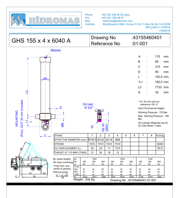 Характеристики гідроциліндра GHS 155-4-6040-L152 А (43175447803)