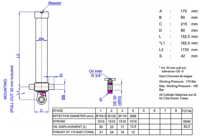 Хід поршня становить 6040 мм, що дозволяє застосовувати циліндр у різноманітних завданнях, що потребують значного висування. Діаметр штока 175 мм та діаметр вуха GE 50 (Ø50) забезпечують надійне кріплення та стабільну роботу. Об'єм циліндра становить 30 літрів, а вага 232 кг, що свідчить про його міцність та здатність витримувати високі навантаження. Цей гідроциліндр є ідеальним вибором для тих, хто шукає довговічне та потужне рішення для підйому та переміщення важких вантажів.