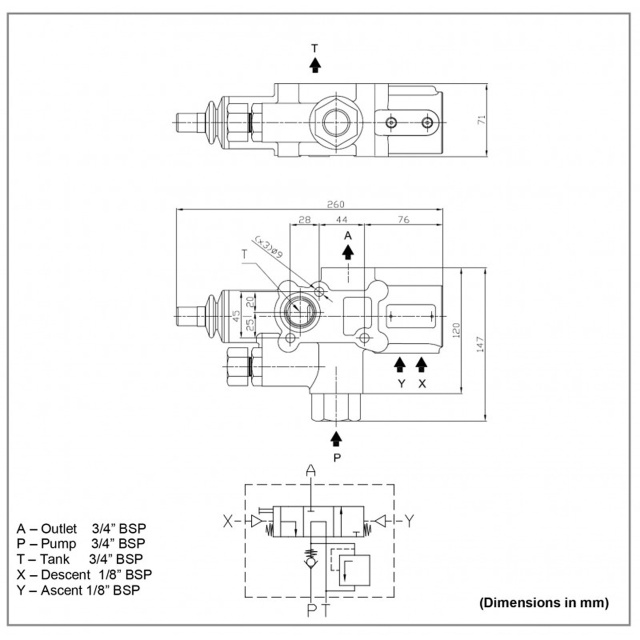 Гідророзподільник з пневматичним пропорційним керуванням DTCA130 від Aber призначений для керування підйомом та опусканням кузова самоскида. Він спрямовує потік робочої рідини в гідроциліндр, забезпечуючи номінальну пропускну здатність 130 л/хв та витримуючи максимальний тиск до 350 бар. Подаючі порти: 3/4” BSP.