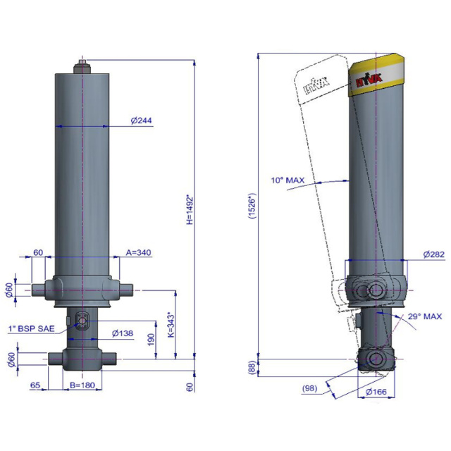 Цей циліндр є лише підйомним пристроєм. Його не слід використовувати як елемент конструкції і не слід піддавати бічним навантаженням. Перекидальний клапан повинен мати скидання тиску на отворі циліндра, встановлене не вище макс. робочого тиску Перевірте максимальне навантаження на циліндр. Робочий діапазон температур становить від -40°C до +80°C. Максимальна тривалість висування становить 0,5 години (за винятком загартованих ступенів із твердим хромуванням). Циліндр пофарбований у чорний колір (RAL9005) з мінімальною товщиною покриття, що відповідає 480-годинному випробуванню в нейтральному сольовому тумані згідно з ISO 9227. ¹ Клапан скидання Hyva.