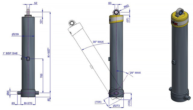 Цей циліндр є лише підйомним пристроєм. Його не слід використовувати як елемент конструкції і не слід піддавати бічним навантаженням. Перекидальний клапан повинен мати скидання тиску на отворі циліндра, встановлене не вище макс. робочого тиску Переконайтеся у максимальному навантаженні на циліндр. Робочий діапазон температур становить від -40°C до +80°C. Максимальна тривалість висування становить 0,5 години (за винятком загартованих ступенів із твердим хромуванням).Циліндр пофарбований у чорний колір (RAL9005) з мінімальною товщиною покриття, що відповідає 480-годинному випробуванню в нейтральному сольовому тумані згідно з ISO 9227. ¹ Обмежувач ходу циліндра Hyva.