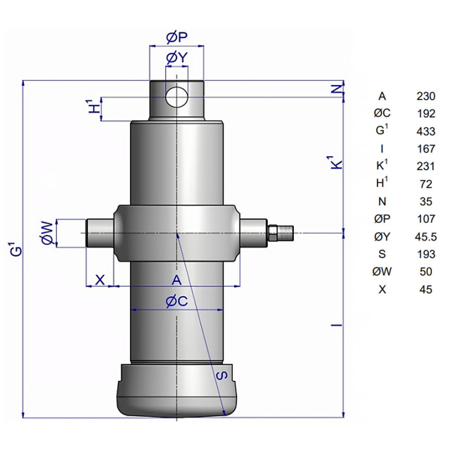 Циліндр легкий, використовує менше масла, що дозволяє швидше підіймати та опускати кузов, і він міцний та не потребує обслуговування. Робочий тиск розрахований на 220 бар. Елементи кріплення слід замовляти окремо.