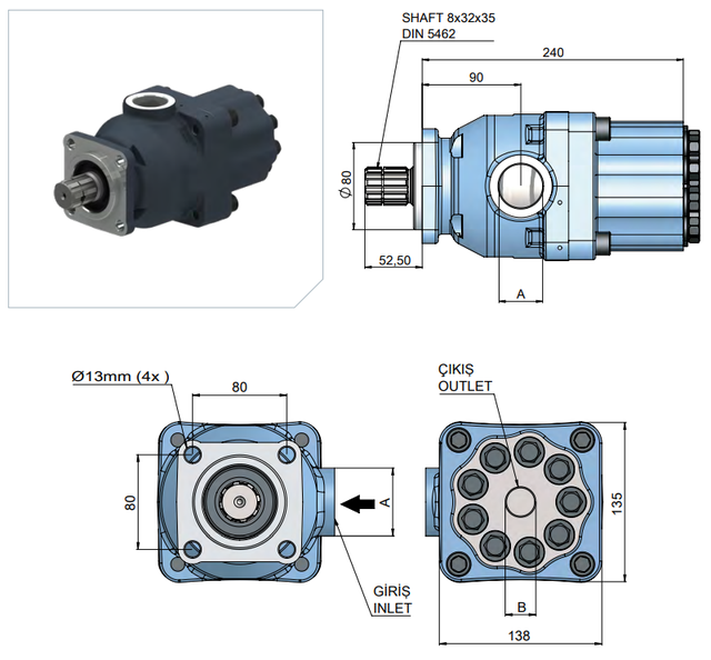 Стандарт приєднання: Вал B8x32x36 (8 шліців, Ø36 мм), монтажний фланець ISO (4 отвори, 80x80).