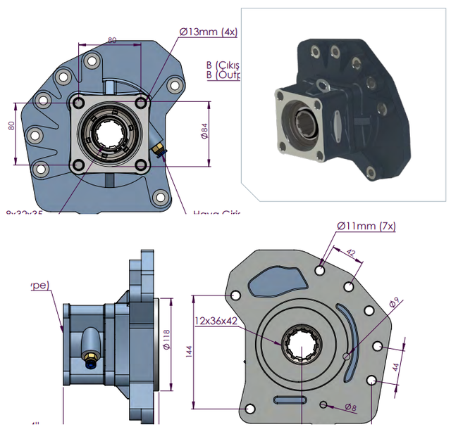 Приєднувальний стандарт: Вал B8x32x36 (8 шліців, Ø36 мм), Монтажний фланець ISO (4 отвори, 80x80).