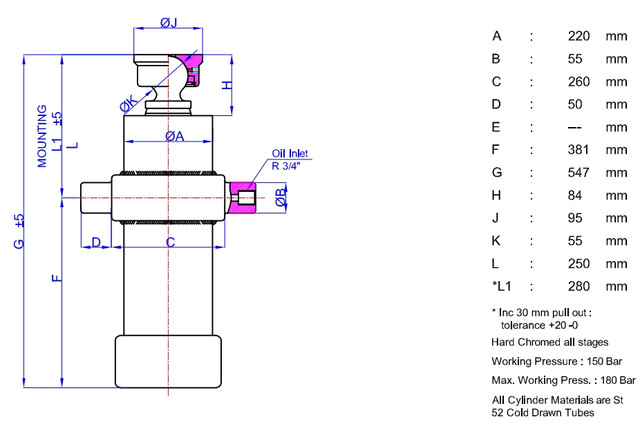Цей гідроциліндр має вражаючу вантажопідйомність до 45 тонн і загальним ходом, включаючи висування, до 2400 мм. Максимальний робочий тиск досягає 190 бар, а робочий тиск - 150 бар, що забезпечує стабільну та безпечну експлуатацію. Із загальним обсягом 38 літрів, модель GHS 197-8-2400 K здатна справлятися з великими обсягами роботи, гарантуючи високу продуктивність.