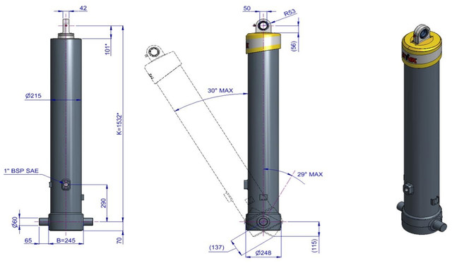 | Максимальне навантаження циліндра (початок перекидання) | 345 кН |